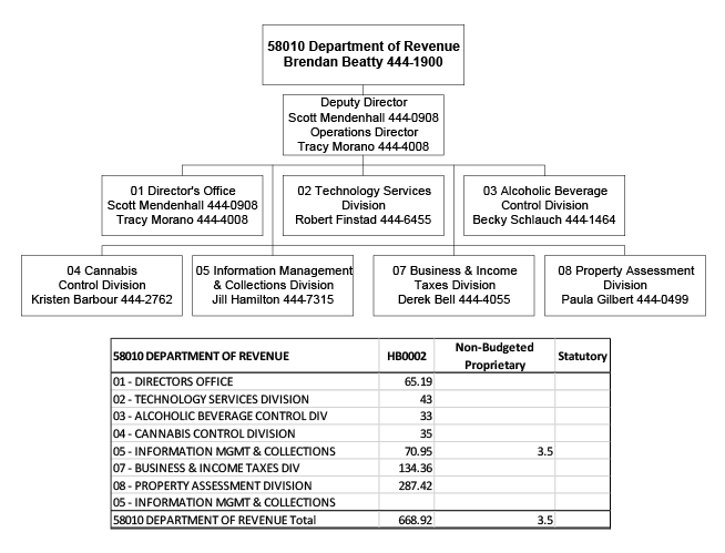 The Department of Revenue administers about 40 Montana taxes and fees to achieve equity and integrity in taxation. Additionally, the department: values all property as accurately as possible and supervises Montana’s property tax system; administers liquor and cannabis laws to protect public health and safety; receives abandoned property and seeks to return it to its rightful Montana owners; administers unlocatable mineral trusts; informs and advises the Governor, the Legislature, and the public on tax trends and issues; and cooperates with local, state, tribal, and federal governments to advance the public interest under the law.