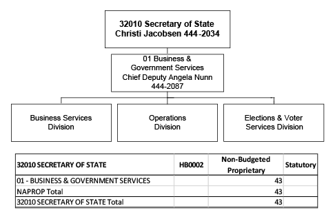 The Secretary of State’s budget consists primarily of non-budgeted proprietary funds, with some additional governmental funds for capital projects and from federal grants. Due to the fact that the proprietary funds are not budgeted, no historical write-up is provided.