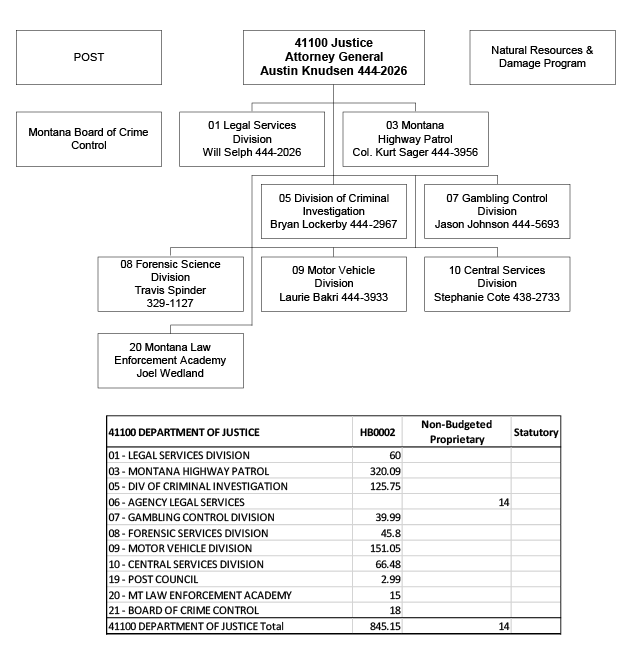 The Department of Justice, under the direction of the Attorney General, is responsible for statewide legal services and counsel, law enforcement and public safety. The duties of the department are as follows: