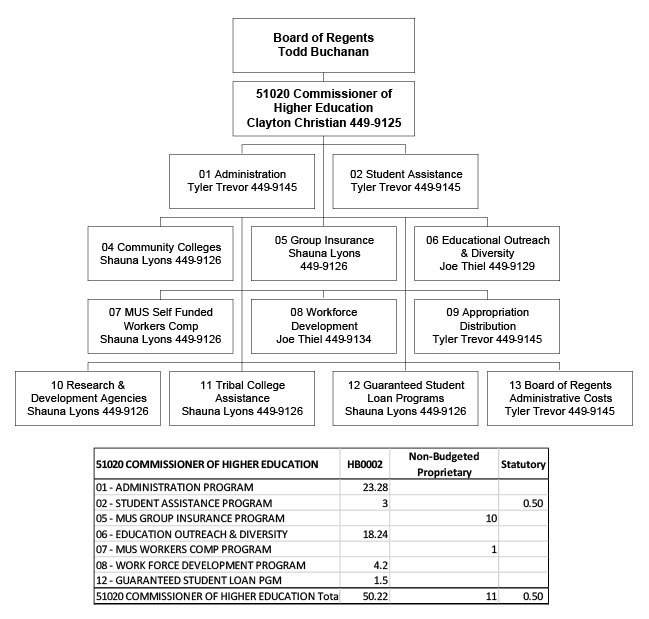 The Office of the Commissioner of Higher Education (OCHE) is the state-level administrative organization of the Montana University System (MUS). The Montana Constitution, Article X, Section 9, grants governance authority over the MUS to the Board of Regents (Regents), with seven members appointed by the Governor. All state funds appropriated by the legislature to the Regents for the support of the MUS are channeled through OCHE. The Constitution charges the Regents with hiring a Commissioner of Higher Education (CHE) who serves as its executive staff.